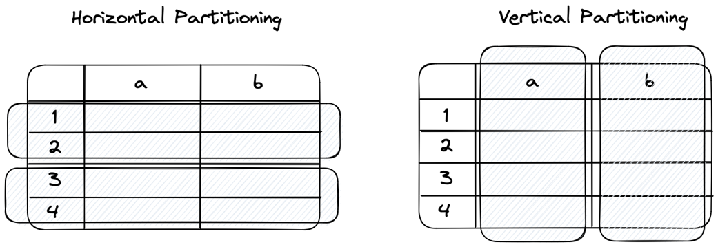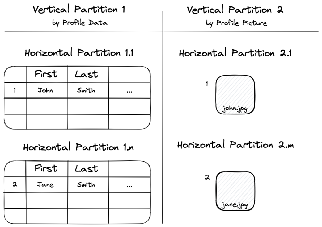 Horizontal partitioning (or sharding) divides data by rows, and vertical partitioning divides data by columns; both can be combined to manage different data types and scale aspects of the application independently.