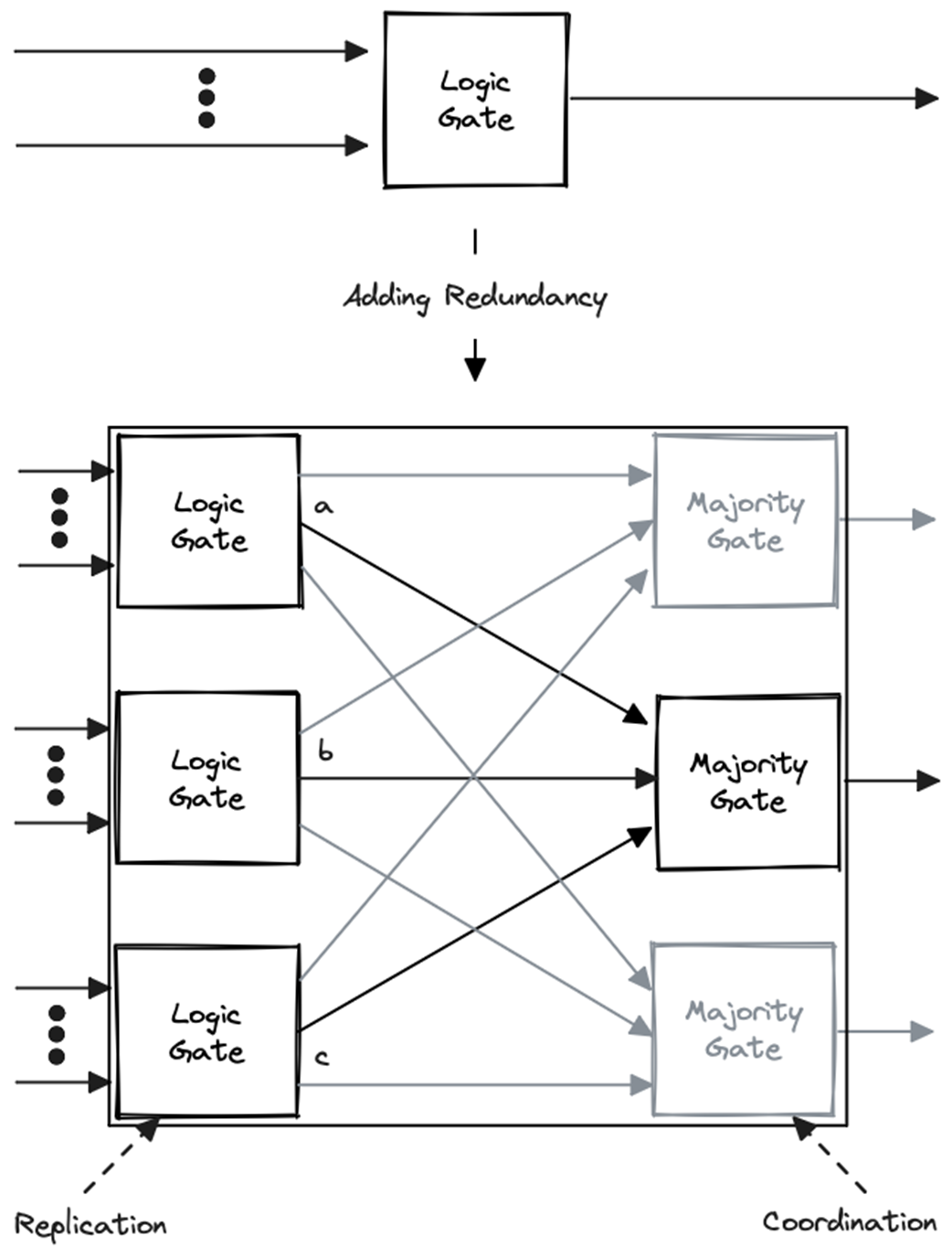 Duplicating components alone does not create a reliable system; the duplicates must be coordinated so they behave like one coherent component. Coordination can be simple (load balancing) or complex (consensus). For example, three replicated logic gates coordinated by a majority vote can tolerate one failure while preserving correct output.