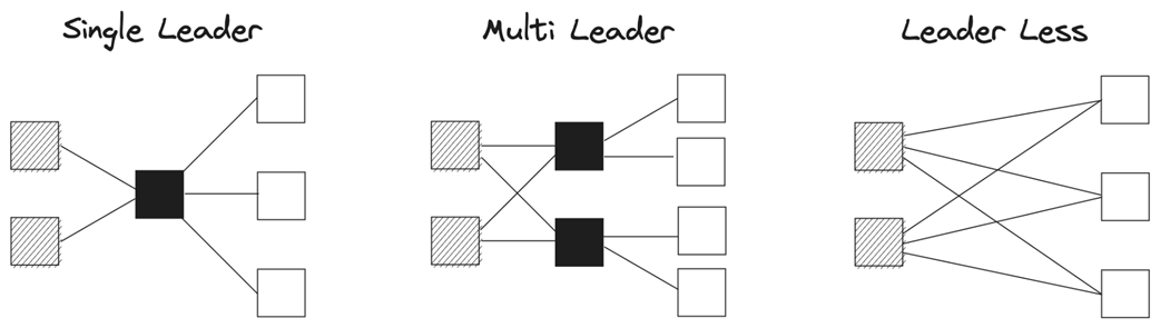 - Single-leader: one node accepts operations and propagates to followers—simple “chain of command,” but the leader can become a single point of failure.