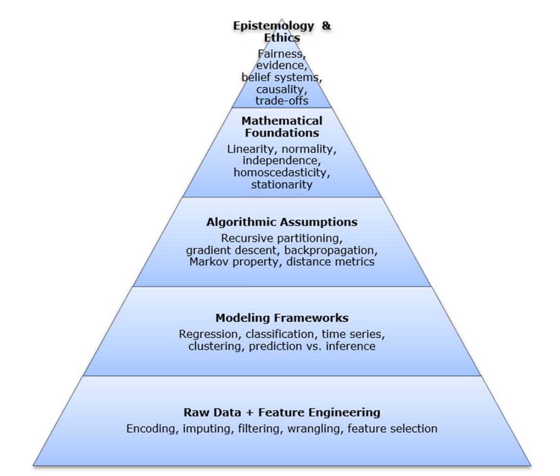 The hidden stack of modern intelligence. This conceptual diagram illustrates the layered structure beneath modern intelligence systems, from raw data to philosophical commitments. Each layer represents a critical aspect of data-driven reasoning: how we collect and shape inputs, structure problems, select and apply algorithms, validate results through mathematical principles, and interpret outputs through broader assumptions about knowledge and inference. While the remaining chapters in this book don’t map one-to-one with each layer, each foundational work illuminates important elements within or across them—revealing how core ideas continue to shape analytics, often invisibly.