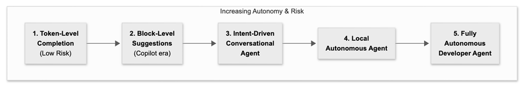 The autonomy-risk spectrum: each step grants more leverage but demands tighter verification, governance, and engineering discipline