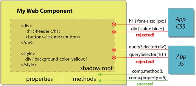 The Shadow DOM protects your component from unintended consequences when CSS or JS might affect styles and nodes inside that aren’t meant to be altered. Instead, your component would have a custom-defined API to interact with using methods and properties.