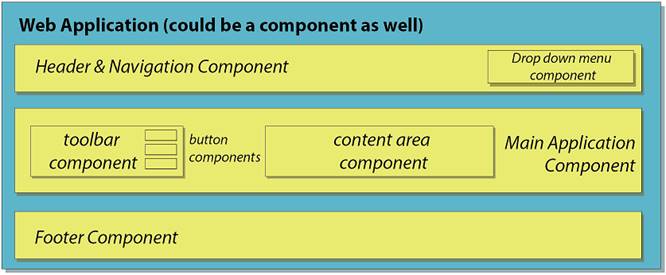 Example web application comprised of Web Components, which are themselves made up of more Web Components. The hierarchy can extend to something small, like a custom button, or be as large as the entire application wrapped as a Web Component.